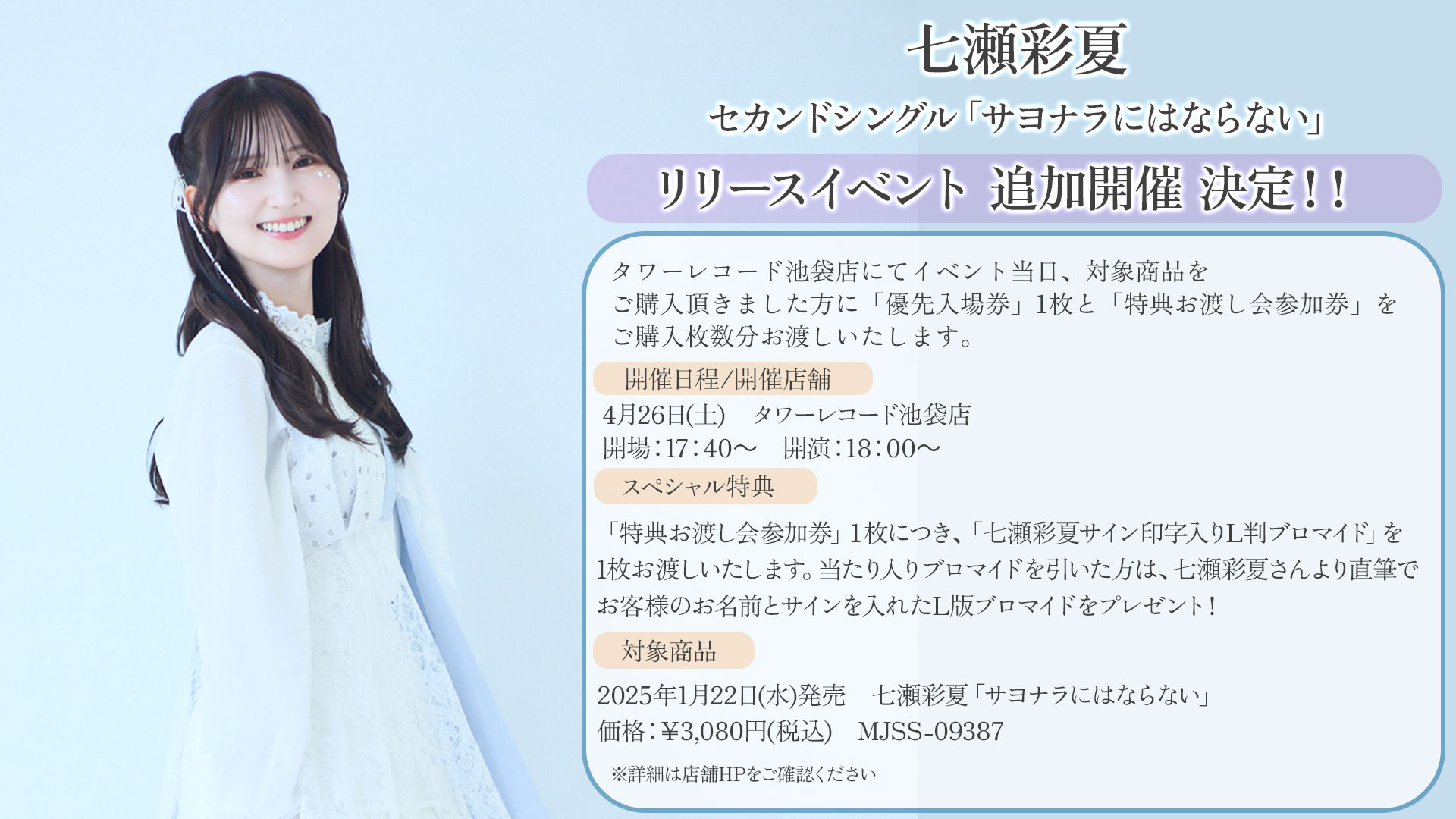 2025年1月22日発売七瀬彩夏「サヨナラにはならない」のリリースを記念しまして、ミニライブ&特典お渡し会の追加開催が決定しました! 店舗詳細はこちら イベント概要イベント開催店舗にて、2025/1/22発売 七瀬彩夏「サ…
