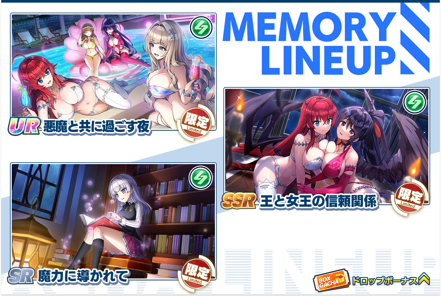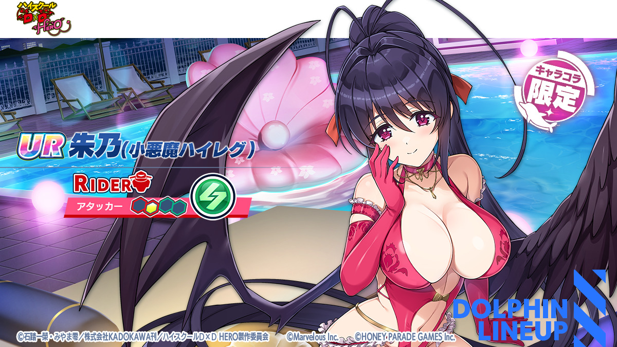 ※「URリアス(小悪魔ガーターベルト)」、「UR朱乃(小悪魔ハイレグ)」及びコラボ限定のメモリーはハイスクールD×Dコラボドルフィンフェスガチャ限定で登場します。