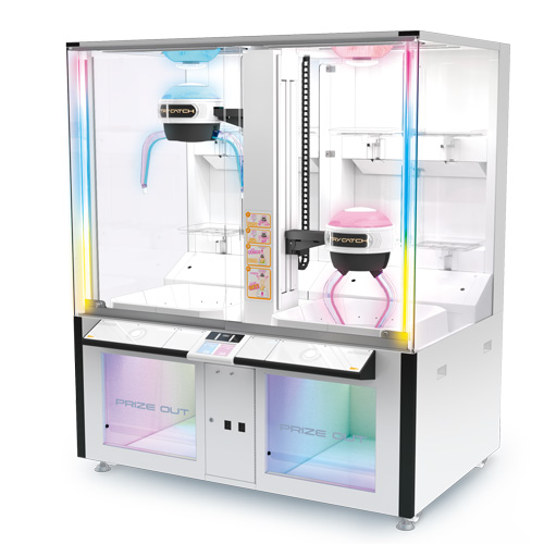 同時に2人がプレイできるツイン筐体かつ直径500mm(重量1.5kg)までの超大型景品に対応しながらも、マシンの設置面積の省スペース化を実現。